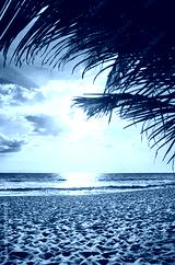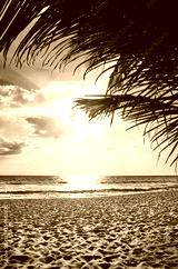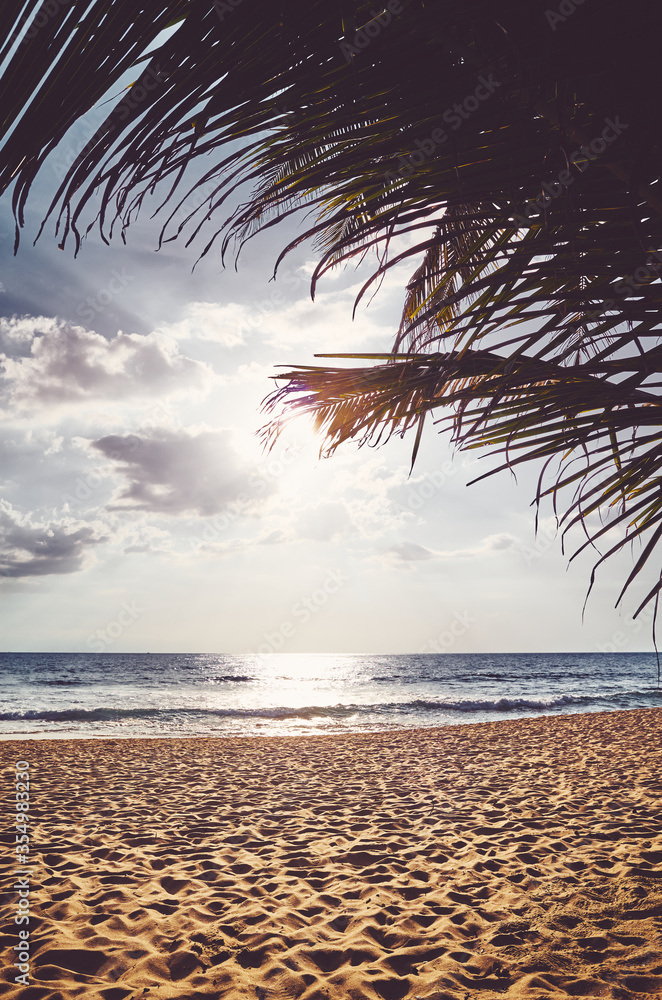 Tropical beach with palm tree leaves at sunset, color toning applied.