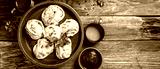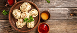 The concept of oriental cuisine. Uzbek food Manti or manty dumplings restaurant concept. Homemade Uzbek dish. recipe background. space for text. top view