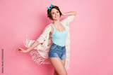 Portrait of her she nice attractive lovely lovable charming pretty cheerful cheery confident girl air wind blowing strolling enjoying free time isolated over pink pastel color background