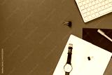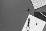 Top view of modern office desk with copy space. Empty weekly planner, keyboard, watch, stationery on pastel green background.