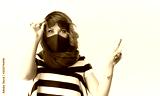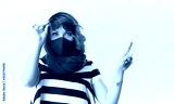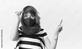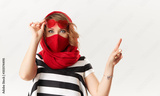 Woman in trendy fashion outfit during quarantine of coronavirus. Model in protective stylish red face mask and heart shape sunglasses on white background pointing finger to the right
