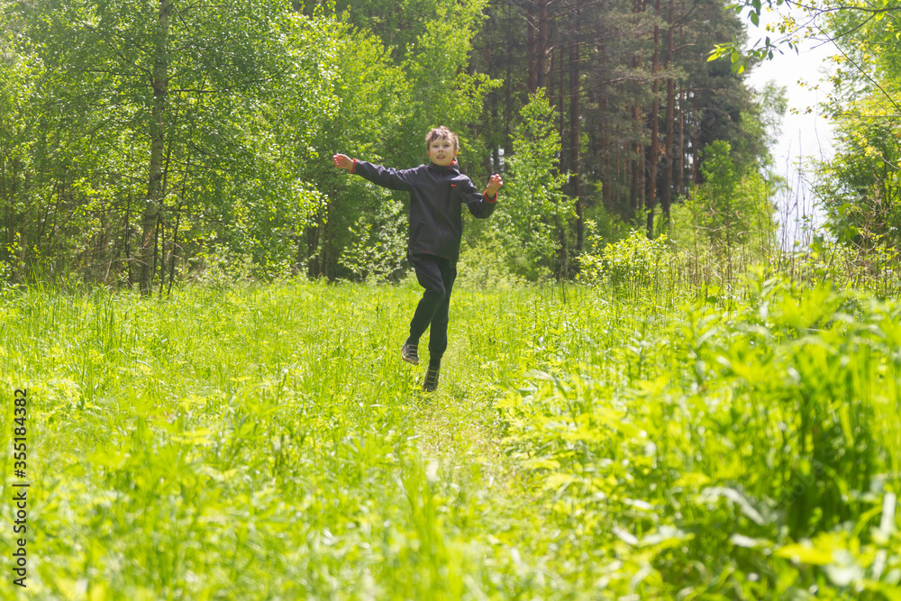 A teenage European boy jumps and has fun in the woods on the lawn in spring or summer.