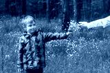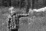A European boy is holding a bouquet of white forest flowers. A child gives a bouquet to his beloved mother for a holiday.