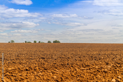 Fresh plowed field in Russia. Arable land in spring or autumn. The vast, endless field with the soil.