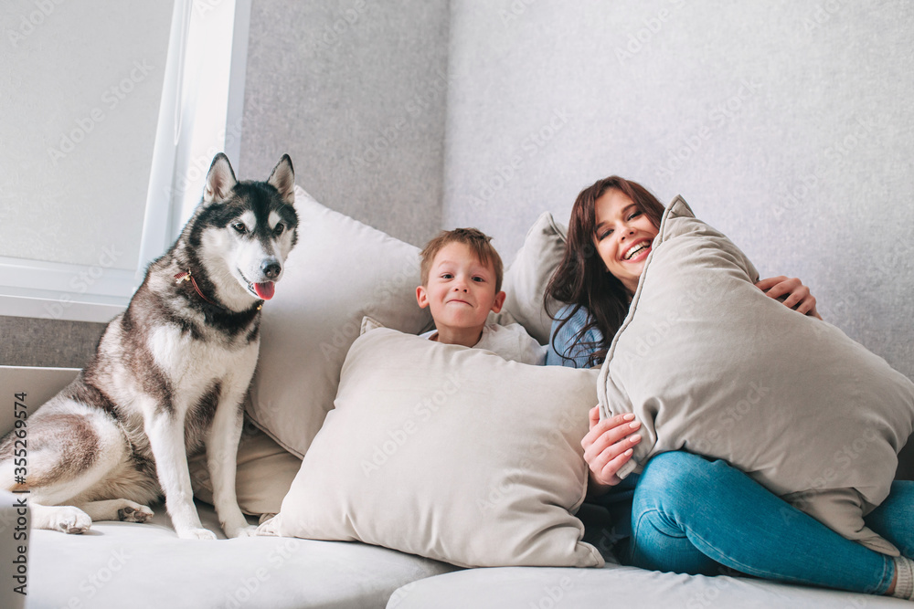 Happy mother and son playing with dog at home