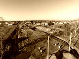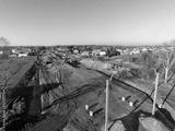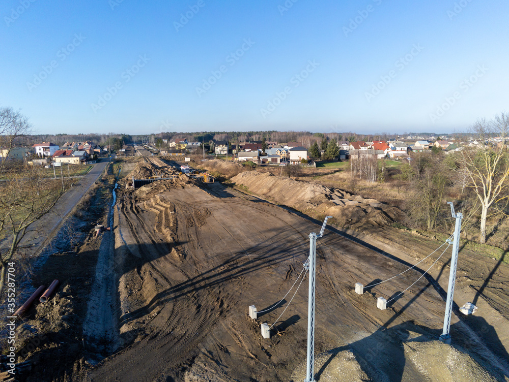 Railway works in small village. Railroad construction and modernisation site. Aerial view on excavator and railway track components.