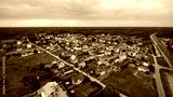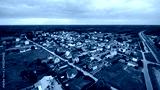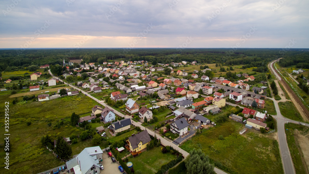 Aerial view on small village located in central Poland. Summer landscape, cloudy afternoon. Green meadows, calm light. Small detached houses, streets, railroad.