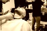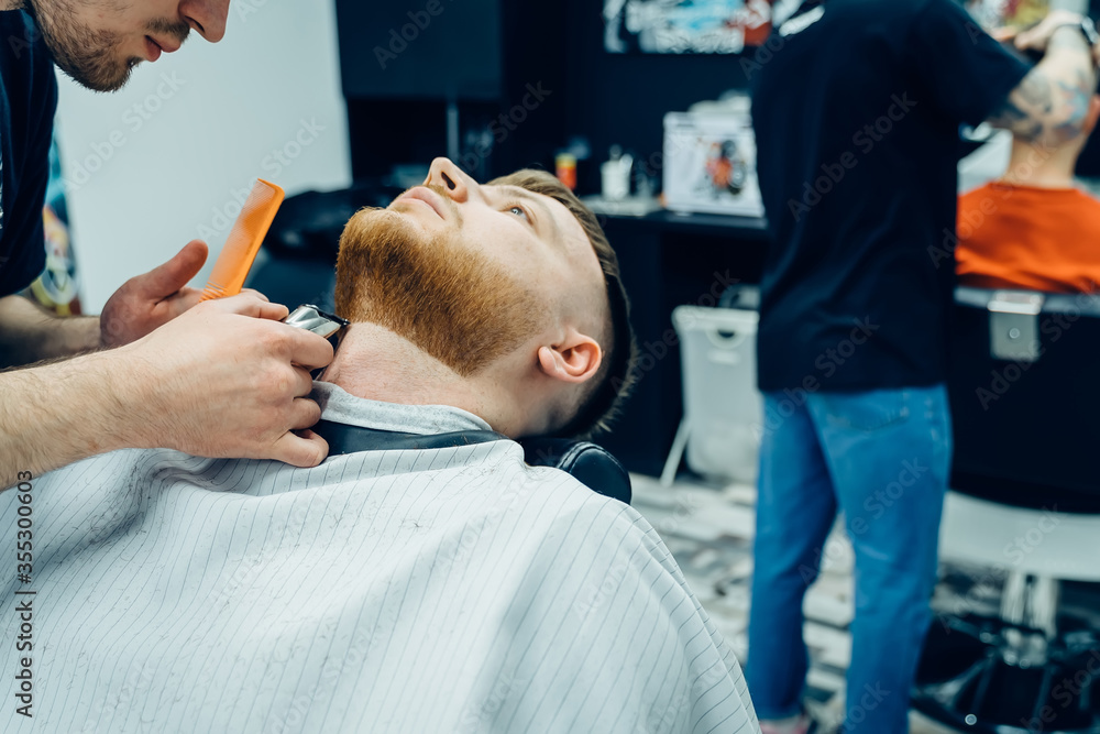 Barber trimming bearded man with shaving machine in barbershop. Hairstyling process. Close-up of a Hairstylist cutting the beard of a bearded male.