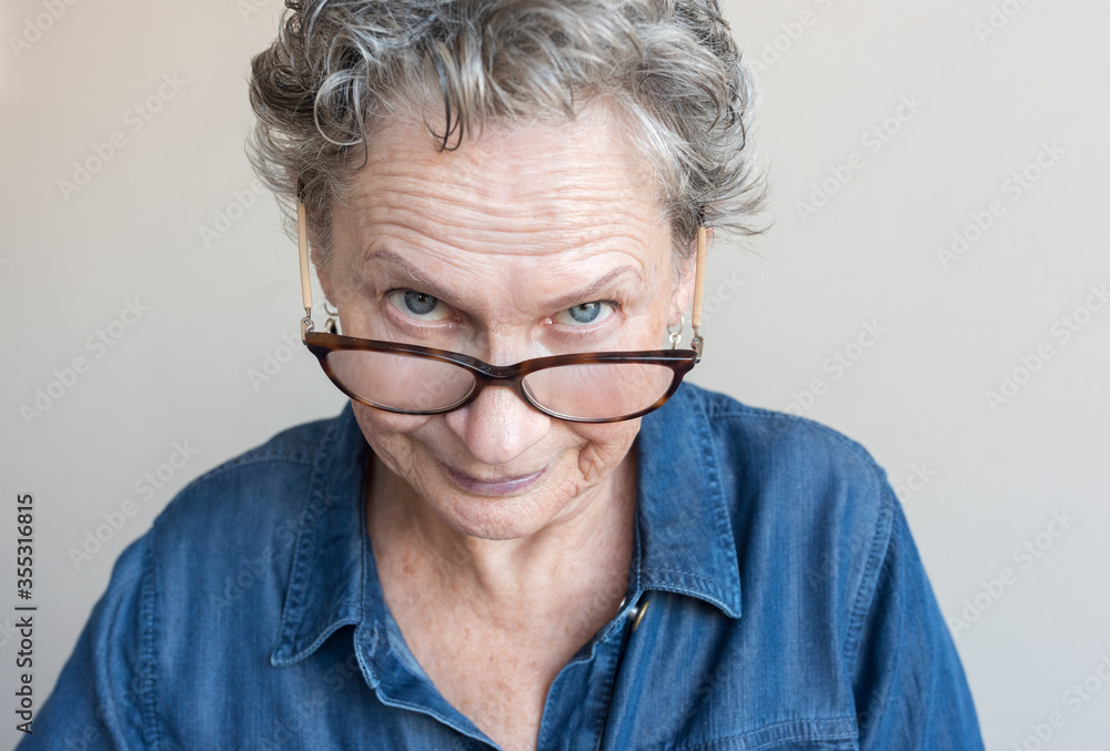 Close up of senior woman with blue eyes peering over glasses against neutral background (selective focus)