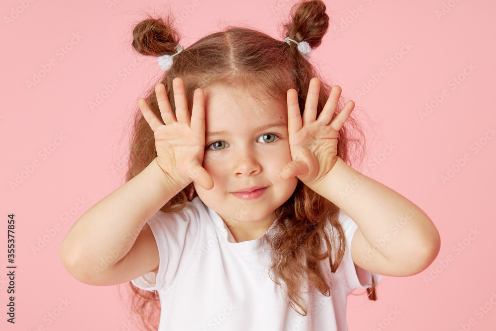 Portrait of surprised cute little toddler girl child over pink background. Looking at camera. Points hands to the left side. Advertising childrens products