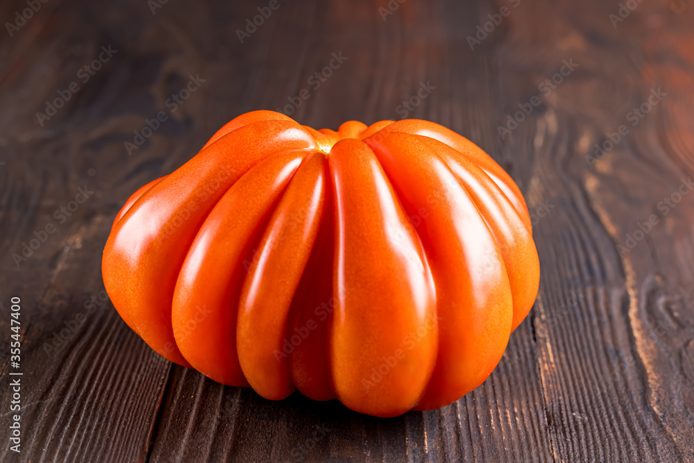 Close up of an red ripe tomato on a wooden board. Funny, weird vegetable. Ugly food.