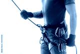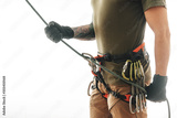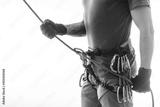 Climber man in safety harness belaying with rope and figure eight indoor.