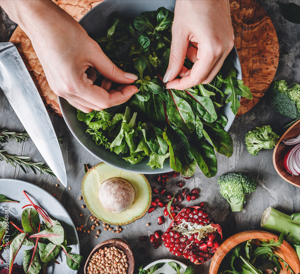 Woman cooking healthy fresh salad with avocado, greens, arugula, spinach in plate over grey background. Healthy vegan food, clean eating, dieting, top view, toning