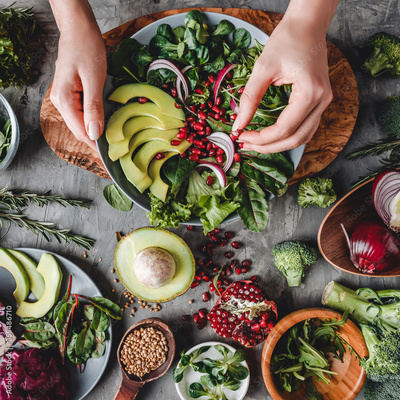 Woman cooking healthy fresh salad with avocado, greens, arugula, spinach in plate over grey background. Healthy vegan food, clean eating, dieting, top view, toning