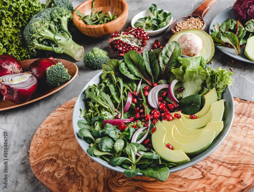 Healthy fresh salad with avocado, greens, arugula, spinach, pomegranate in plate over grey background. Healthy vegan food, clean eating, dieting, top view