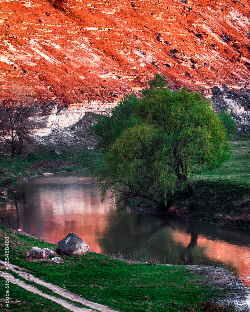 Beautiful landscape of summer hills with river in Moldova, Old Orhei. Zigzag river flows between valleys with willow trees and rocks at sunset. Travel background, Europe