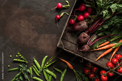 Fresh vegetables, radish, tomato, carrot, beetroot, peas in wooden box on dark background. Freshly bunch harvest. Healthy organic food, agriculture, top view