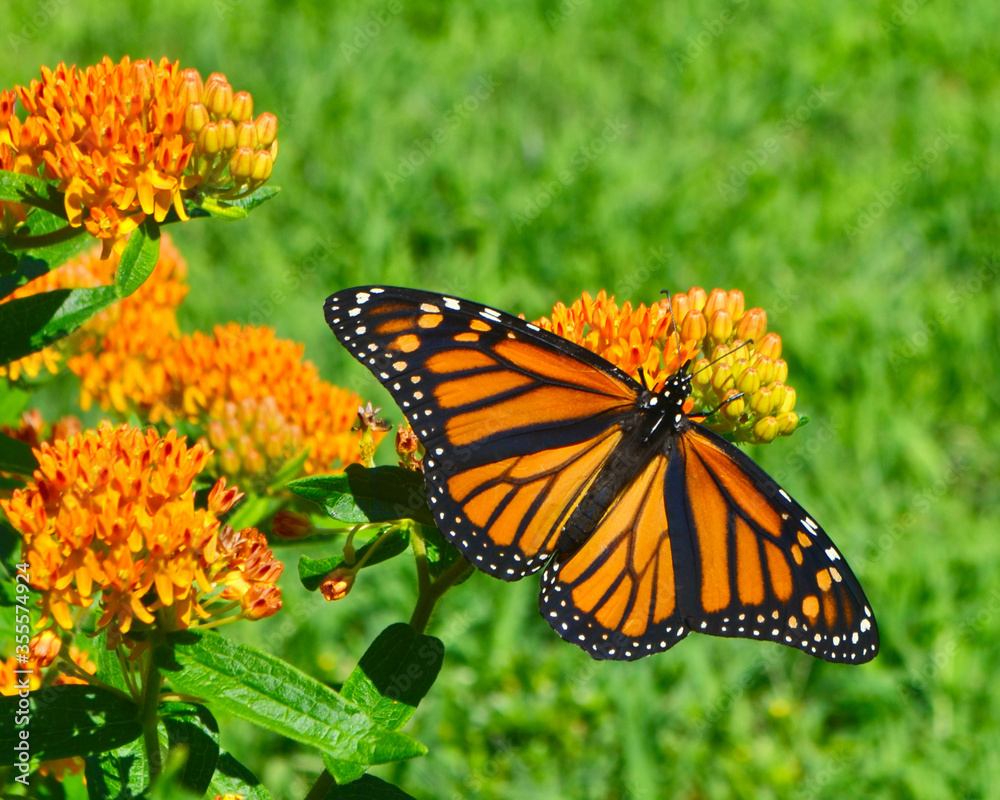 Monarch Butterfly (Danaus plexippus) feeding on the nectar of Butterfly Weed (Asclepias tuberosa). Close up. Copy space.