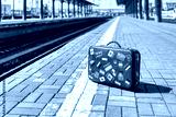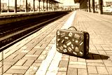 Little retro traveler suitcase on a passenger platform. Empty train station.