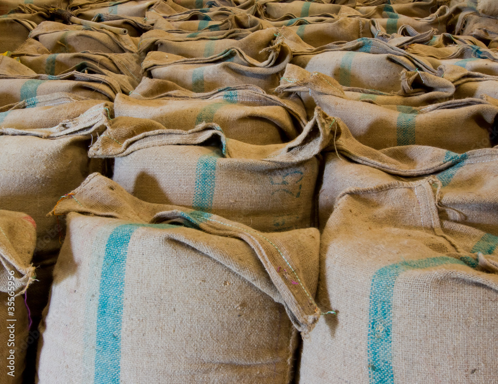 Pile of rice sacks in grain warehouse