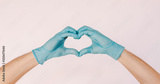 Male hands in blue medical gloves gesturing love sign isolated on white background. Man doctor in protective surgical latex gloves show heart shape symbol with fingers. Health care, charity, safety