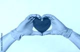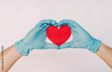 Closeup man doctor in latex protective gloves hold red heart symbol in hands isolated on white background. Male nurse hands in medical gloves gesture heart love sign. Charity, donation, health care