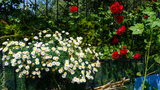 Lots of white daisies and red roses in the garden.