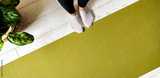 Woman legs on an exercise mat with copy space. Preparing to do yoga at home. Female practicing yoga.