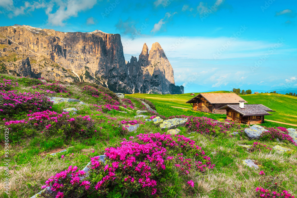 Hiking and touristic resort with pink rhododendron flowers, Dolomites, Italy
