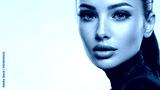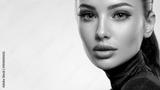 Portrait of beautiful young woman with bright pink makeup. Beautiful brunette with bright orange lipstick on her lips.