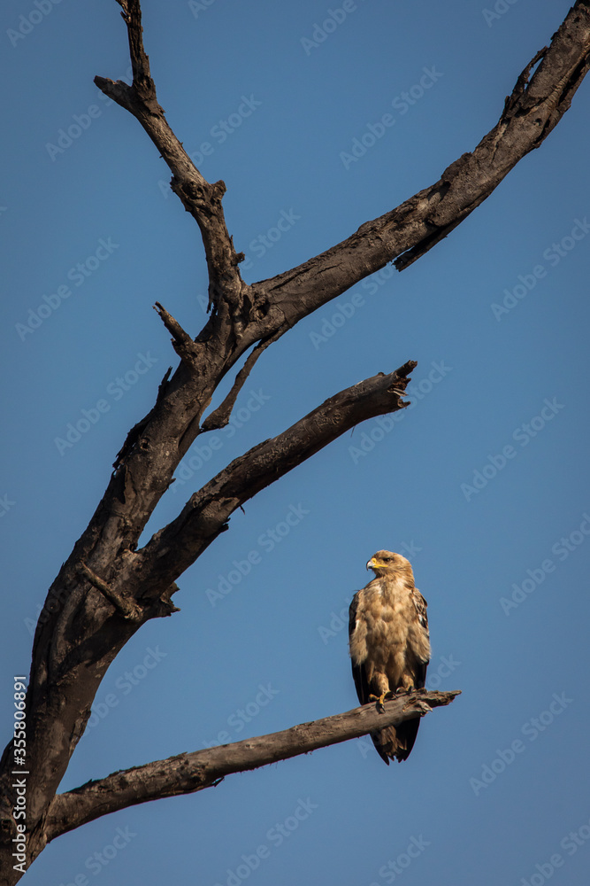 Hawk resting on a tree in Serengeti National Park in Tanzania during safari with blue sky in background. Wild nature of Africa