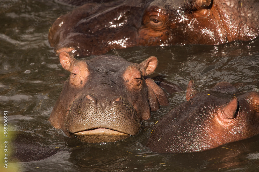 Group of hippopotamus in the water in a beautiful landscape of Serengeti National Park, Tanzania. Wild nature of Africa.