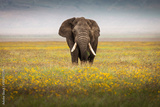 Elephant eating grass during safari in National Park of Ngorongoro, Tanzania. Beautiful yellow flowers around him. Wild nature of Africa.