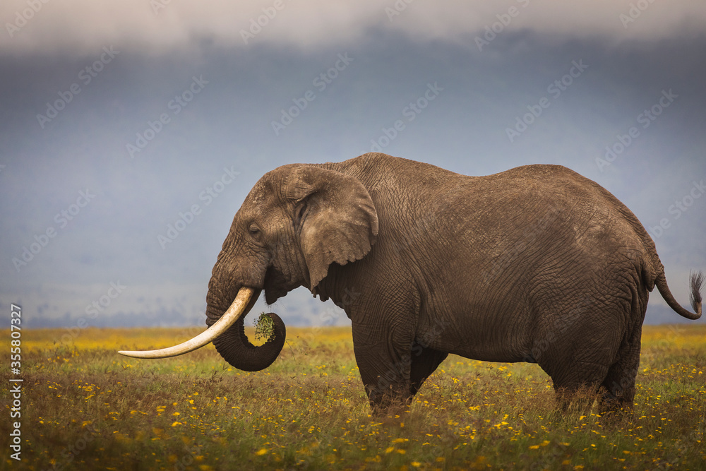 Elephant eating grass during safari in National Park of Ngorongoro, Tanzania. Beautiful yellow flowers around him. Wild nature of Africa.