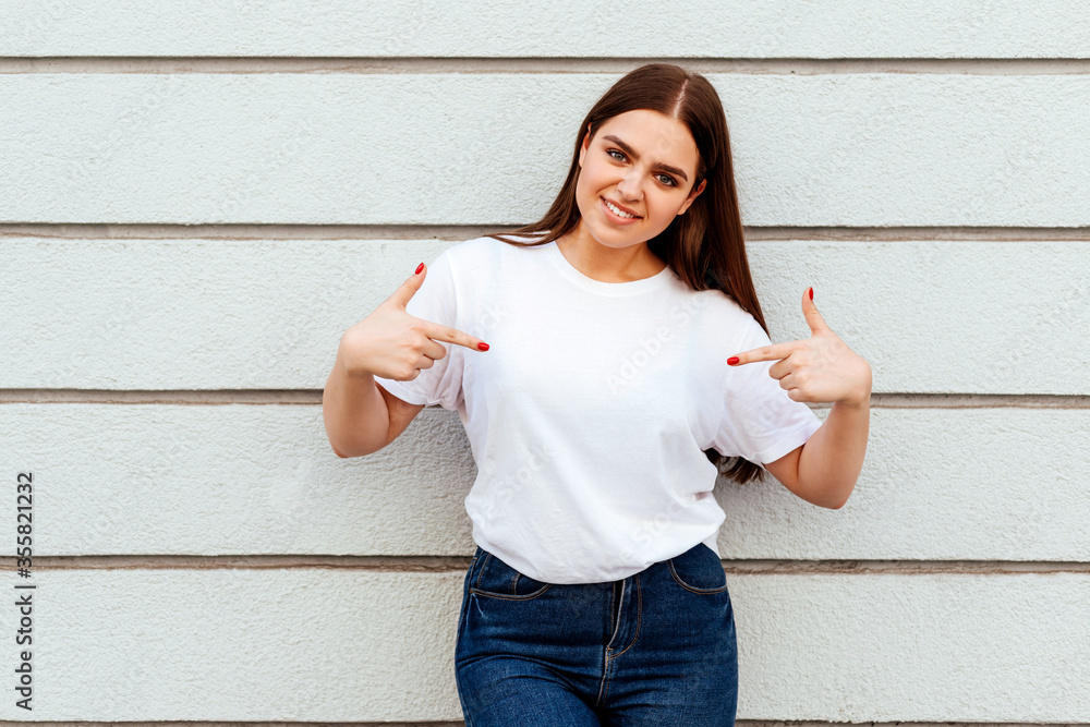 young attractive girl wearing a white t-shirt standing on a grey wall background