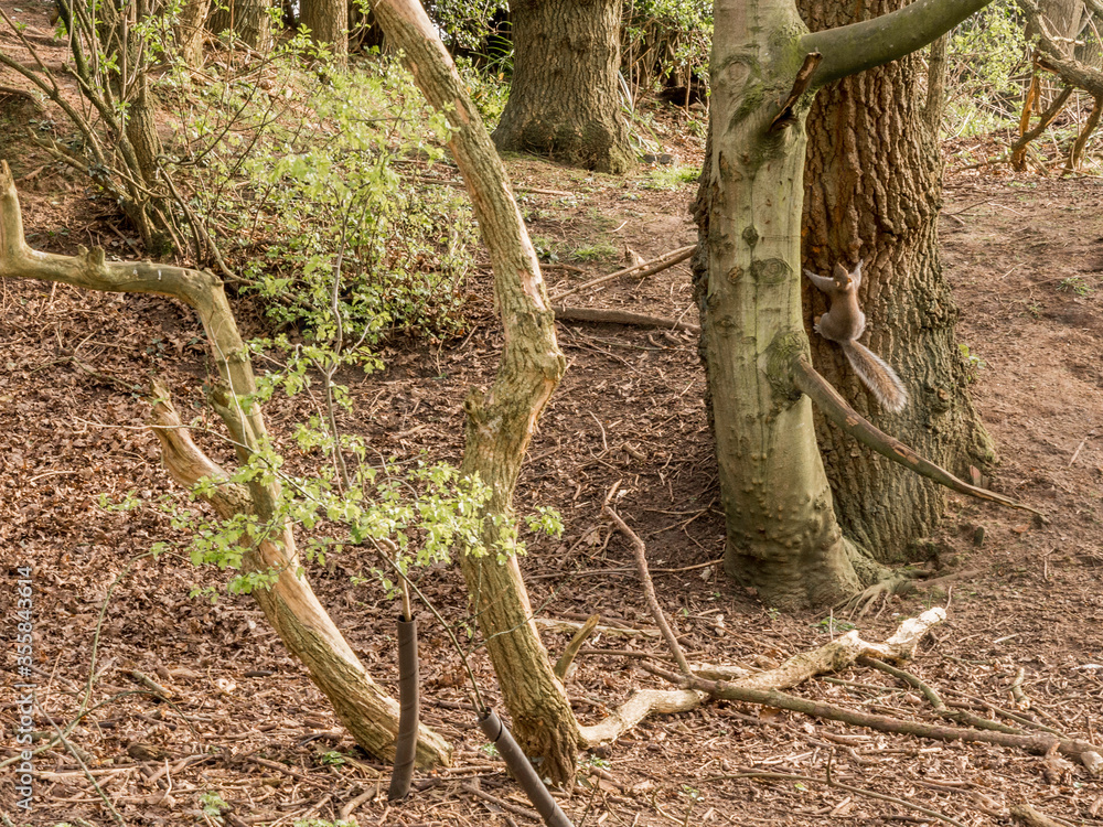 Grey squirrel climbing trees at Pickmere Lake, Piuckmere, Knutsford, Cheshire, UK