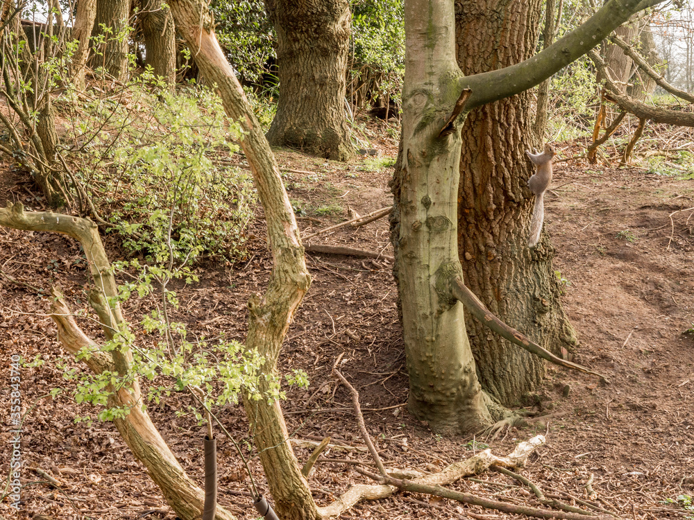 Grey squirrel climbing trees at Pickmere Lake, Piuckmere, Knutsford, Cheshire, UK