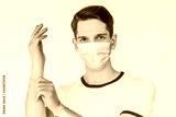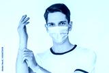 Portait happy male doctor nurse in medical face mask wear protective latex gloves isolated on white background. Young man surgeon in protective mask put on medical gloves. COVID-19 safety, protection
