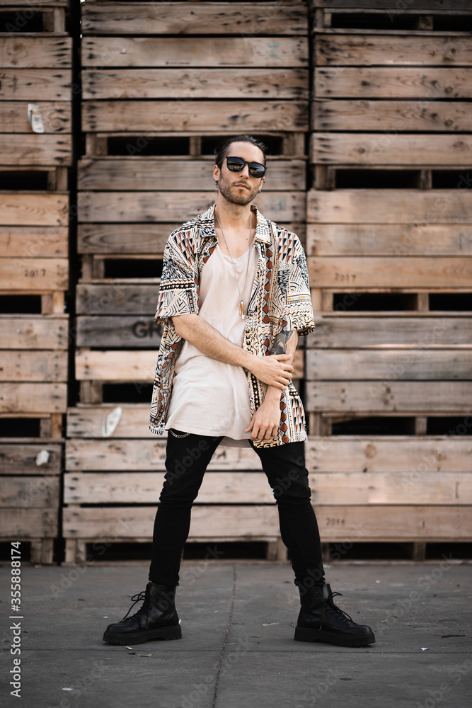Modelo de estilo urbano con gafas de sol.