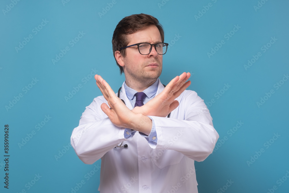 doctor making cross with hands over chest, showing stop and prohibition gesture,