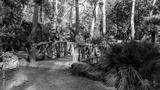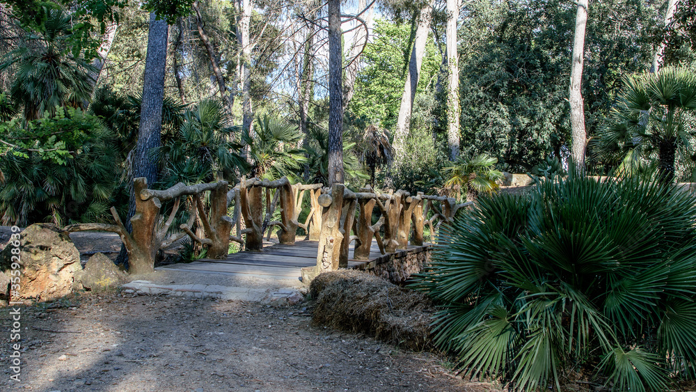 Wooden openwork bridge in the natural park. Detail of architecture.