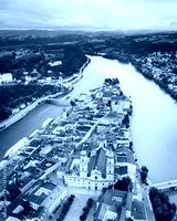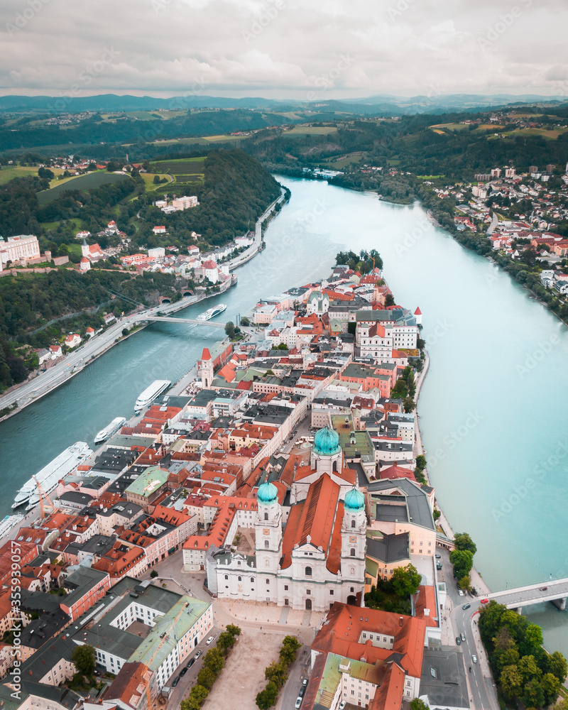 Aerial drone Shot of the Cityscape of Passau, Germany with the famous Passau Dom in the front of the picture