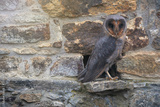 Cool barn owl in dark form is sitting on the stone wall looking at the camera.