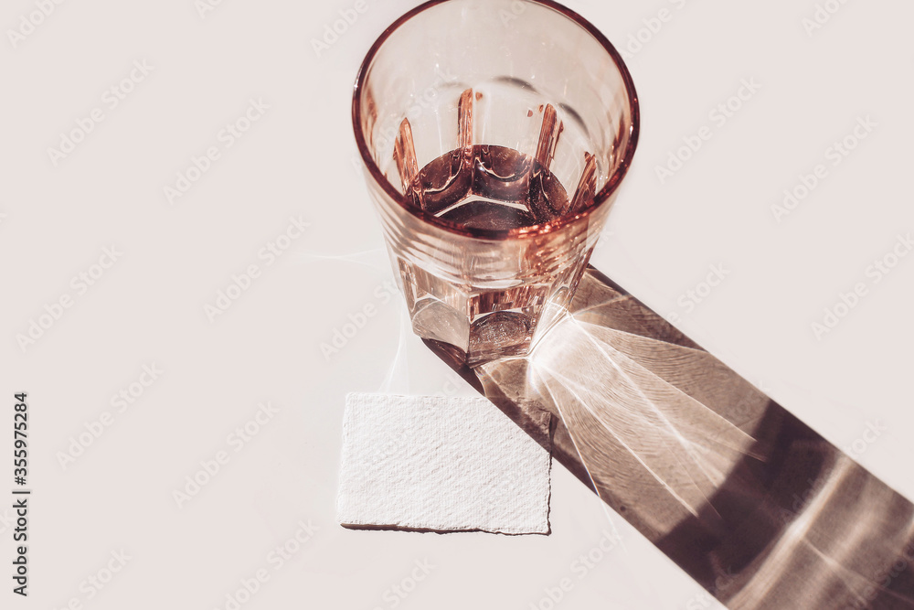 Summer stationery still life scene. Glass of water, cocktail, long shadow. Blank business, place card mockup scene. Pink table background in sunlight. Top view. Birthday, celebration, concept.