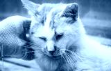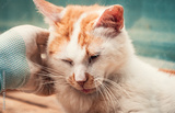 Close-up of volunteer's hand petting caged stray cat in pet shelter. People, Animals, Volunteering And Helping Concept.