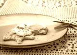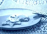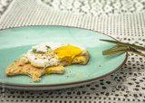 Bitten off sandwich with fried egg and Italian bread on a turquoise plate, blurred background