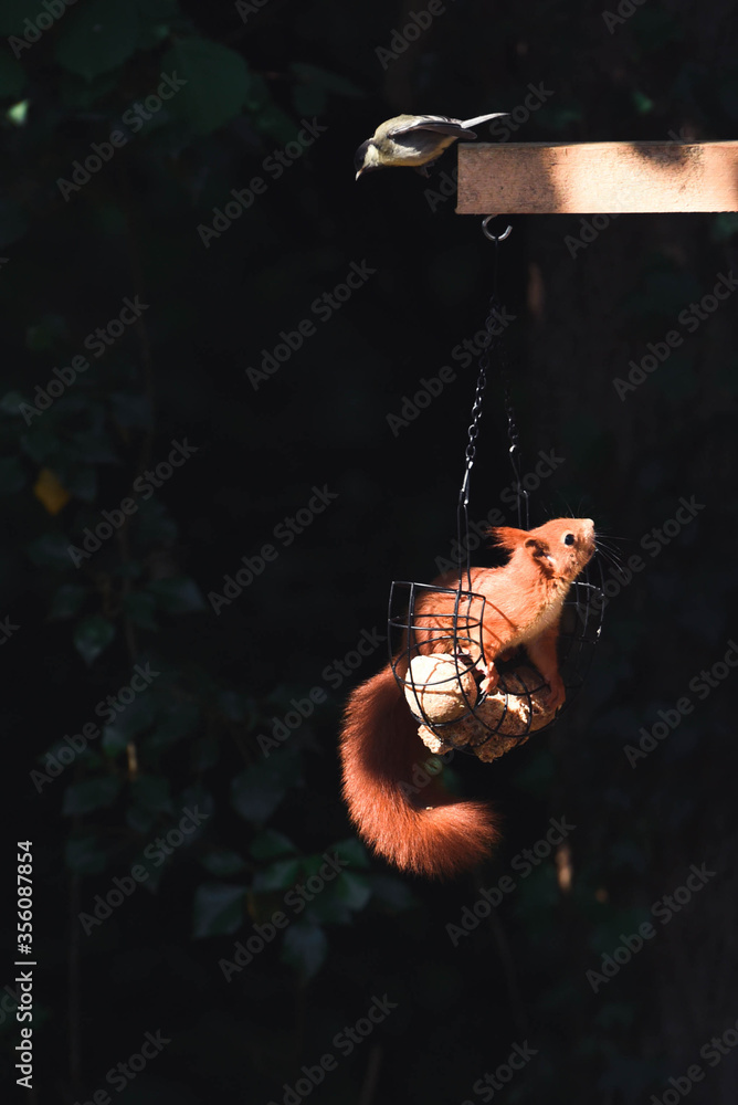 Eichhörnchen sitzt auf einem Meisenknödel und wird von einem Vogel beobachtet