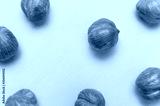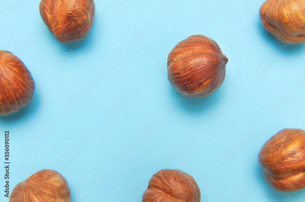 Creative food layout. Hazelnuts on blue background top view copy space. Concept of food, healthy nutrition, nut, healthy fats. Hazelnut Flat lay. Walnut pattern. Organic healthy vegan snack macro shot