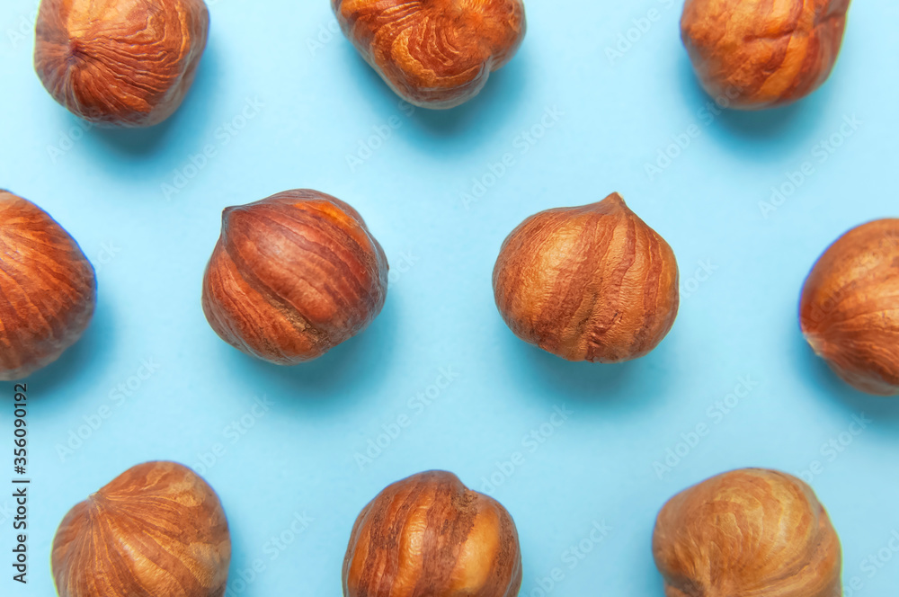 Creative food layout. Hazelnuts on blue background top view copy space. Concept of food, healthy nutrition, nut, healthy fats. Hazelnut Flat lay. Walnut pattern. Organic healthy vegan snack macro shot