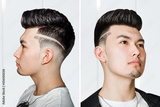 Young man brunette with pompadour volume haircut 50s - 60s. real photo retro hair style for barbershop, side, set